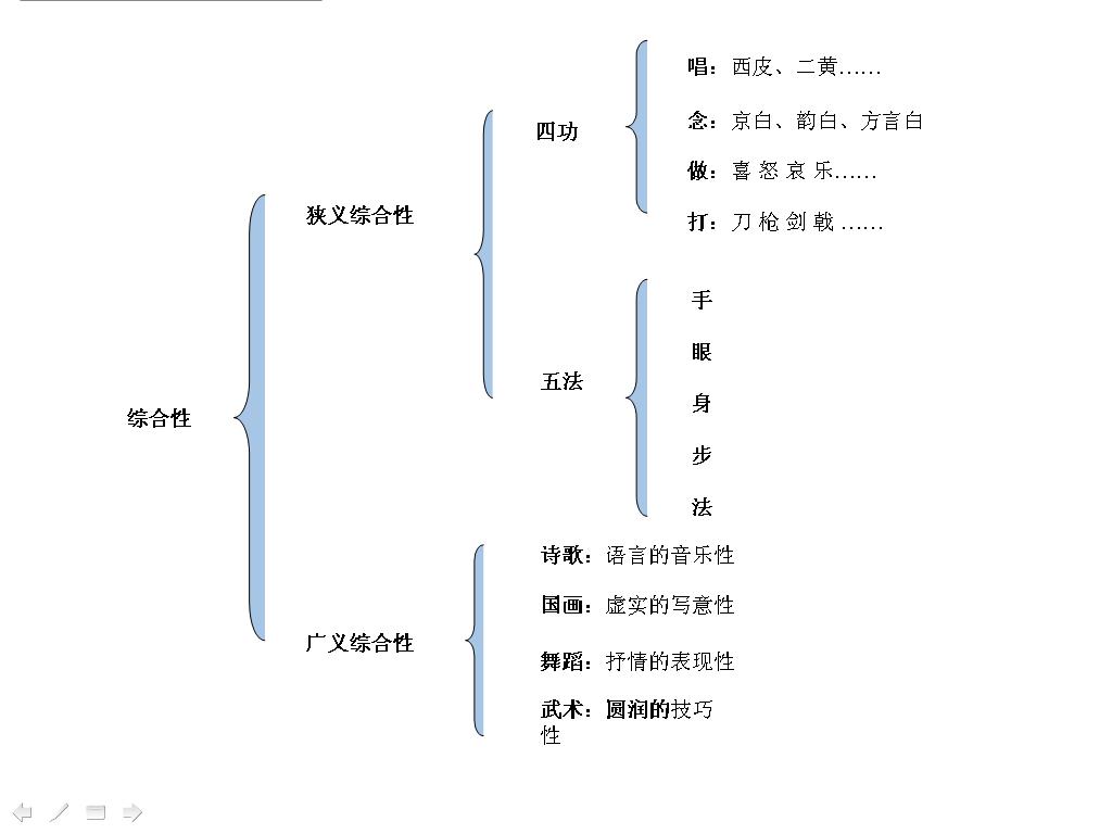 中国戏曲是载歌载舞的一种表现形式,我国著名戏剧理论家齐如山他把诸多主张归结成两句话:“无声不歌,无动不舞”,对戏曲的内涵做了精彩的界定。戏曲是以“唱念做打舞”表演为中心的表演形式。观众从视觉和听觉能感受到一种整体的美感。它不像歌剧只唱不舞不念,芭蕾只舞不说,话剧只说不唱。虽然各有所长但都没有戏曲表演手段丰富。戏曲表演手段极其丰富,它能够满足观众多方面的不同需求,同时又能够为人物塑造提供不同表演材料。这些材料就是我们常说的戏曲演员的基本功“四功五法”。 要求演员要掌握各个方面的基本功,来表现故事情节和人物性格、这是其它艺术形式所不能比拟的,这是戏曲显著的特征之一。