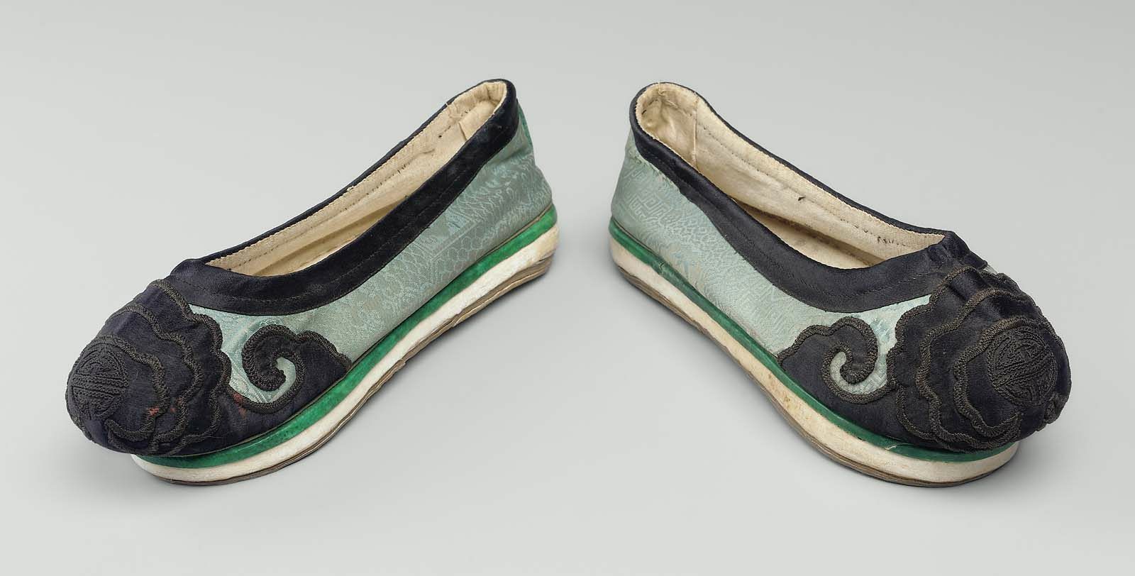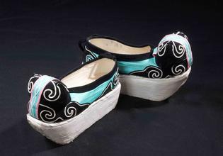 也称“花盆鞋”。源于满族女人的旗鞋鞋帮,鞋面与彩鞋相同,鞋底高约七厘米,似一倒置的花盆,安在鞋底正中,与女式旗装(旗袍)相配套。为异邦国太、后妃、公主等贵族妇女穿用。