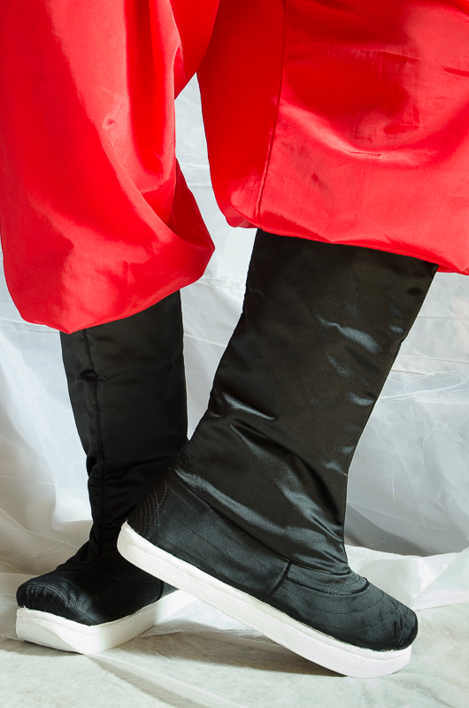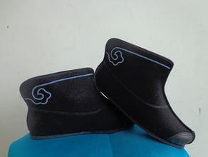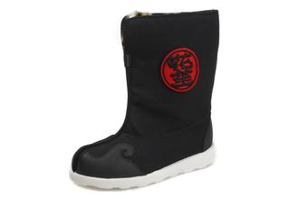 靴底高寸(约三厘米)余,鞋面与鞋帮也是用黑缎与黑绒制作,是丑角用的靴子。扮演丑角官员及太监时穿用。
