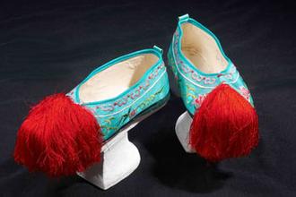 彩鞋用各色绸缎面料制成,缎面绣花鞋尖镶缀各色丝穗,正旦、花旦等都可穿用。