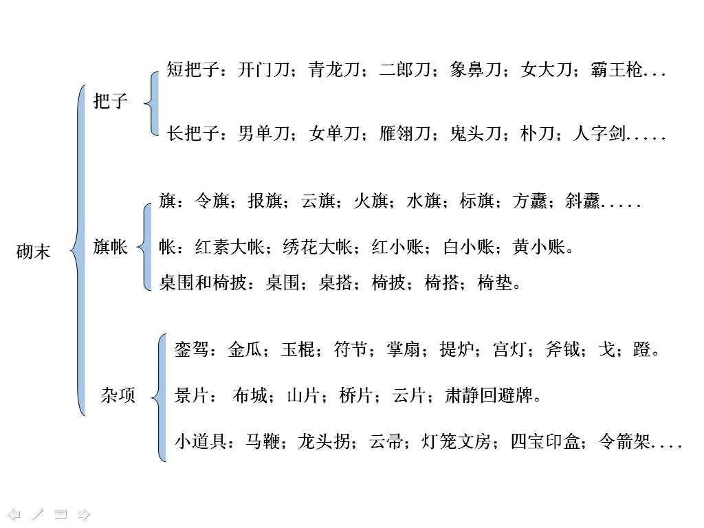 2、类是短把子;男单刀、女单刀、雁翎刀、鬼头刀、朴刀、人字剑、鱼皮剑、朱红宝剑、绣花宝剑、锏、鞭、锤拐、护手双钩、板斧、乾坤圈、弓箭。