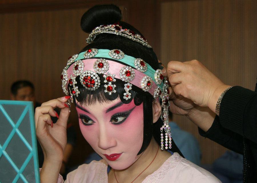 旦行的发式有大头、抓髻头、旗装头、古装头等,旦行除了头发的艺术造型之外,还要在头上佩戴各种饰物。