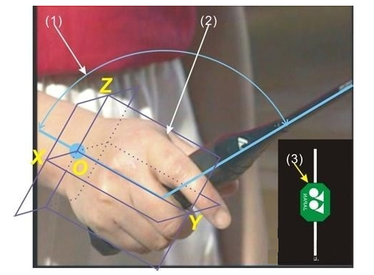 (一)正手握拍(以右手握拍为例):用左手拿住拍柄,使拍面与地面垂直,然后张开右手使手掌下部靠在拍柄底端,虎口对着拍柄最窄的一面,小指、无名指、中指并拢,食指与中指自然分开,弯曲并贴在拍柄上。握拍时掌心不要贴紧拍柄,使掌心与拍柄留有一定的空隙。如图: