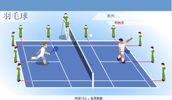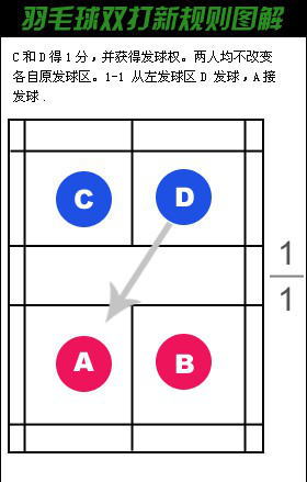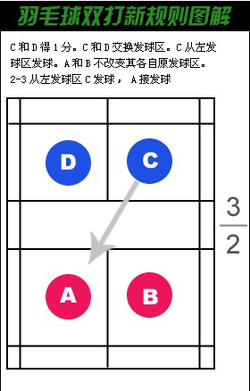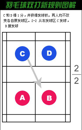 1、发球员的顺序和单打一样,只有发球方得分才交换场地。
