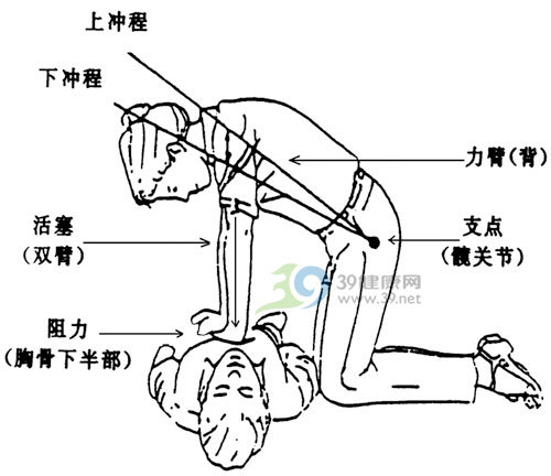 (7)下压用力要垂直向下,身体不要前后晃动。正确的身体姿势既是保证按压效果的条件之一,又可节省体力。