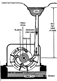 1、水斗式水轮机的组成:喷管、折流板、转轮、机壳、尾水槽