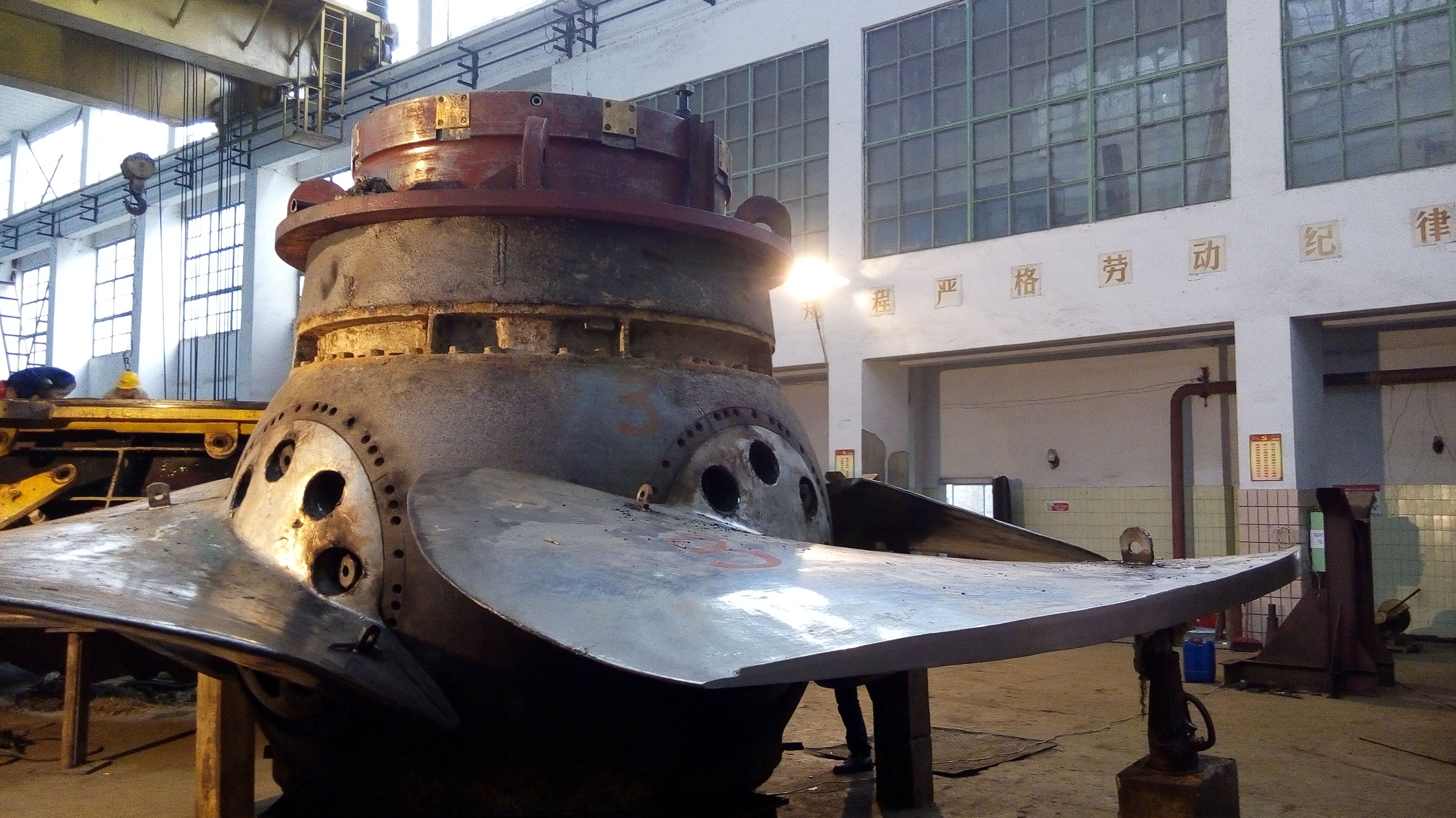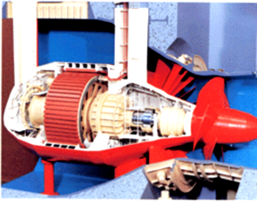 实际上是卧轴安装的轴流式水轮机,发电机安装在灯泡体内(红色的为转子)