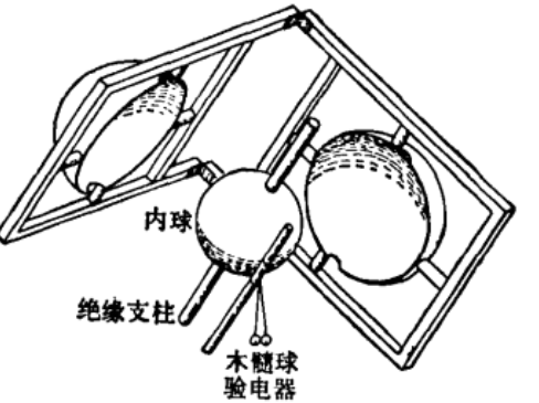 1773年,卡文迪许用两个同心金属球壳做实验,如右图,外球壳由两个半圆装配而成,两半球合起来正好把内球封在其中。通过一根导线将内外球连在一起,外球壳带点后,取走导线,打开外壳,用木髓球验电器试验有没有带电,结果发现木髓球验电器没有指示,内球不带电荷。根据这个实验,卡文迪许确定指数偏差 ,比罗宾逊1769年得出的0.06更精确。