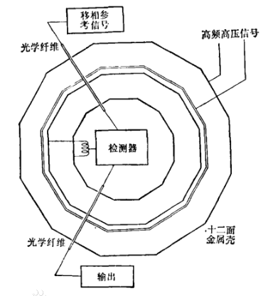 左图是简单示意图,他们用五个同心金属壳,而不是两个,采用十二面体形,而不是球形。峰值为10千伏的4兆赫高频高压信号加在最外面两层金属壳上,检测器接到最里面的两层,检验是否接收到信号。