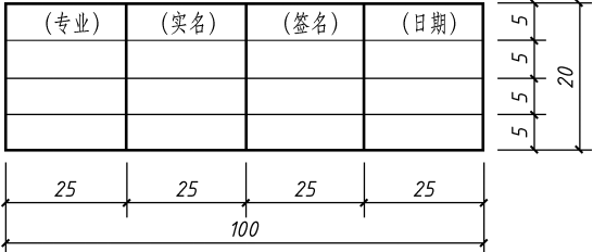 会签栏的格式如图1-3所示,栏内应填写会签人员所代表的专业、姓名、日期。一个会签栏不够时,可以另加一个,两个会签栏应并列,不需要会签的图纸也可以不设会签栏。