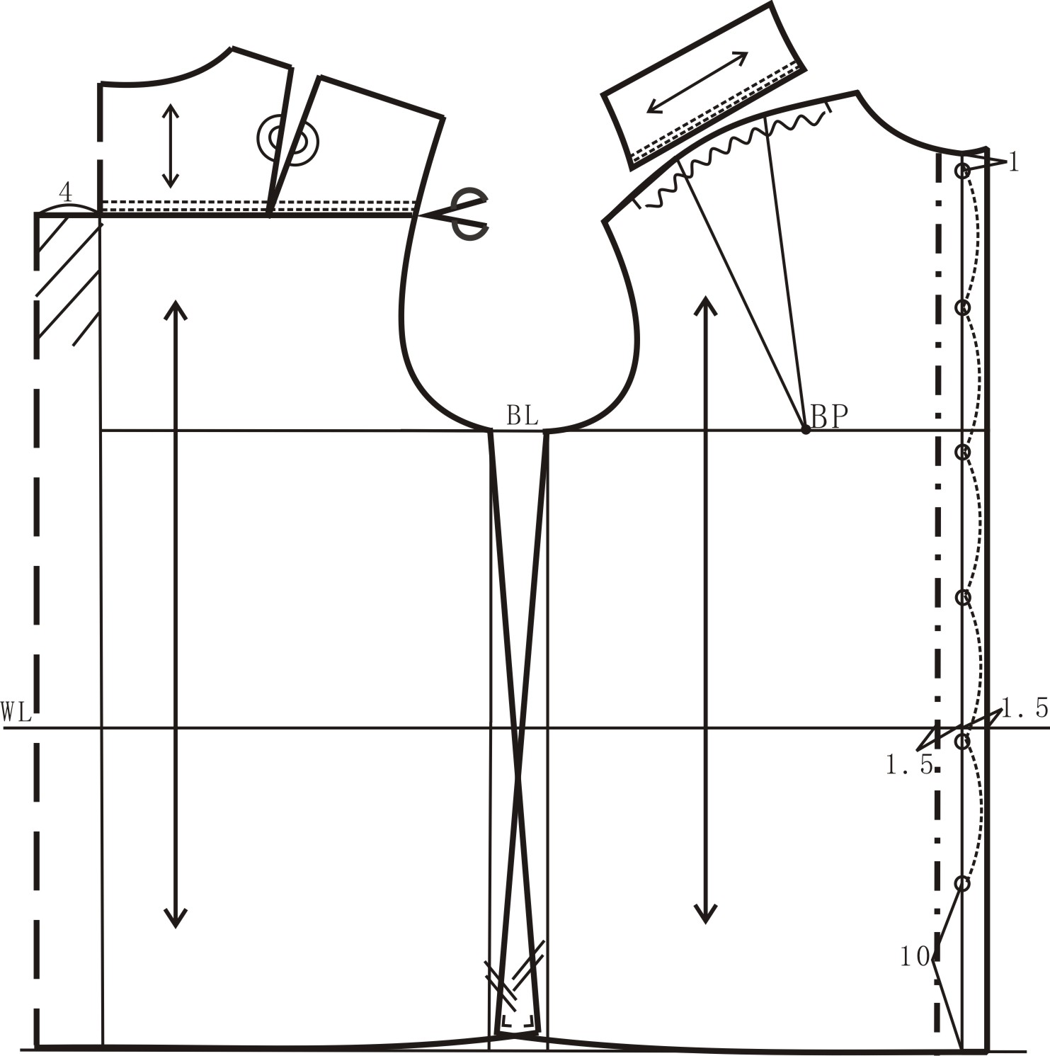 ②绘制上装时,将前、后衣片的腰节线处于同一水平线,且前后衣片的侧缝线相对。前片在图纸右侧、后片在图纸左侧。