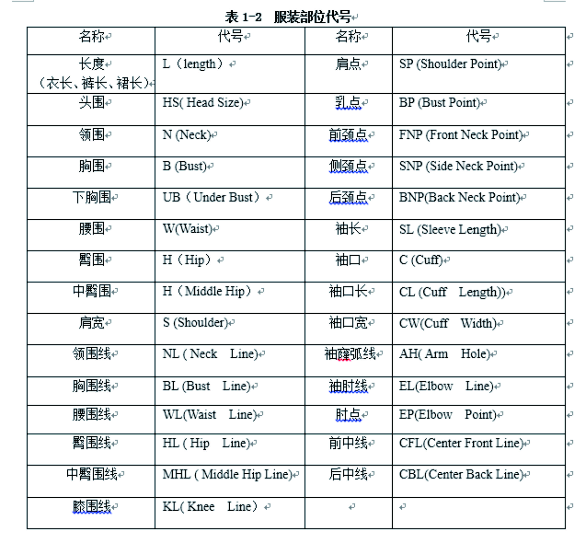 在结构制图中引进部位代号的目的是为了书写方便,图面整洁。国际通用的部位代号大多来源于相应英文字母单词中的首位或者前两位字母。