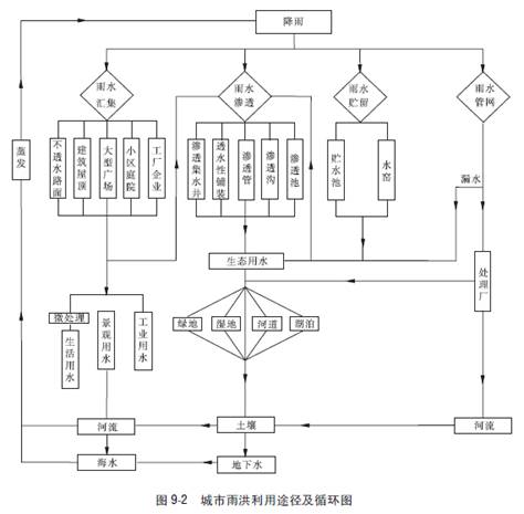 为了利用雨洪资源,应采取相应的措施,比如旧排水管网系统改造、新建城市雨洪排水系统,采用双层排水道,上层排泄雨洪,下层排放污水,实现雨洪污水分流。分流后的雨洪经排水道排至需要景观用水的集中用水点,如人工湖、贮水池等,补充生态用水,用于维持和改善城市的水环境。