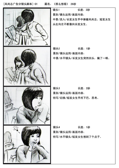 分镜头剧本创作 是把文字进一步视觉化的重要一步,是导演根据文学剧本进行的再创作,体现导演的创作设想和艺术风格,分镜头剧本的结构:图画+文字,表达的内容包括镜头的类别和运动、构图和光影、运动方式和时间、音乐与音效等。其中每个图画代表一个镜头,文字用于说明如镜头长度、人物台词及动作等内容