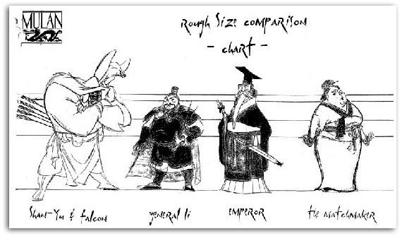 在一部动画片中,一般会由许多角色组成。每个角色之间的个性、形态既独立又有关联。为了保持角色在一部作品中的大小比例一致,不同角色之间的形体大小比例要根据剧本要求设计。动画片中原动画都是由集体共同制作,所以有一个标准化的角色造型十分重要。角色造型设计要标明身体比例,以便让全体工作人员参照,绘制防止出现动画片在制作过程出现形象变形、失真、跳帧等情况。比例图是指标示着动画片中各个角色不同身体高度比例和主要角色身体各部位间比例的画稿。