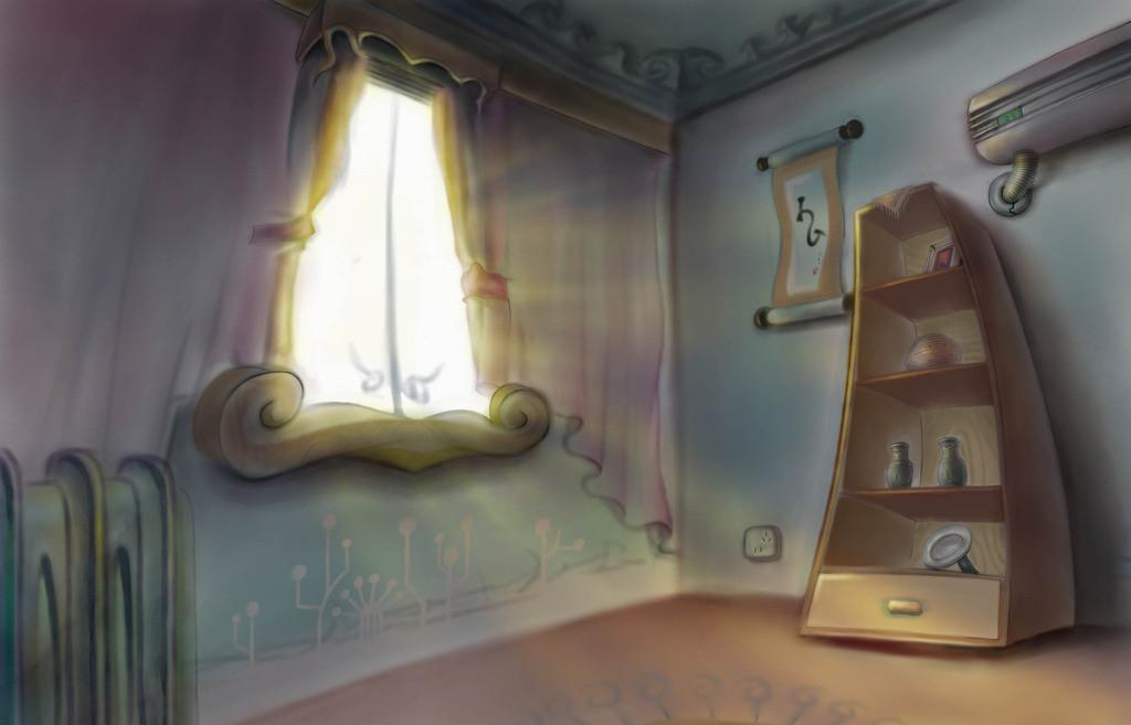 室内景是人物(动物)所居住与活动的房屋建筑、交通工具等的内部空间。在内景设计中,显得动画场景的空间变化较多,但不完整。内景的应用,优化了设计的造型元素,在视觉上更有利于角色的塑造,更主要的是有利于角色“戏份”的表现。在设计这种场景时,一定要根据剧本所揭示的人物的特定情况来考虑,设计其中的道具、空间布局和色彩运用。室内空间(特别是私人的)具有个性化的特点,观察其中的陈设和空间布局及色彩配置,都可以大致判断出主人的身份、性格、爱好、经济收入、阶层、时代、地域等诸多情况。在设计公共室内空间的场景时,要更多地考虑地域、用途,同时还要考虑建筑本身的尺度及其中角色之间的比例关系等因素。如图5—6所示。