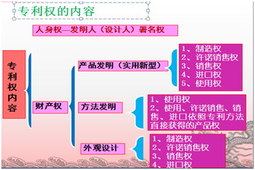 5.进口权。专利权人依法享有的进口其专利产品的专有权利。进口权是指专利权人享有的自己进口或者禁止他人未经允许,为生产经营目的进口由该专利技术构成的产品或进口包含该专利技术产品或进口由专利方法直接生产的产品的权利。