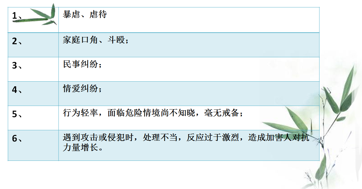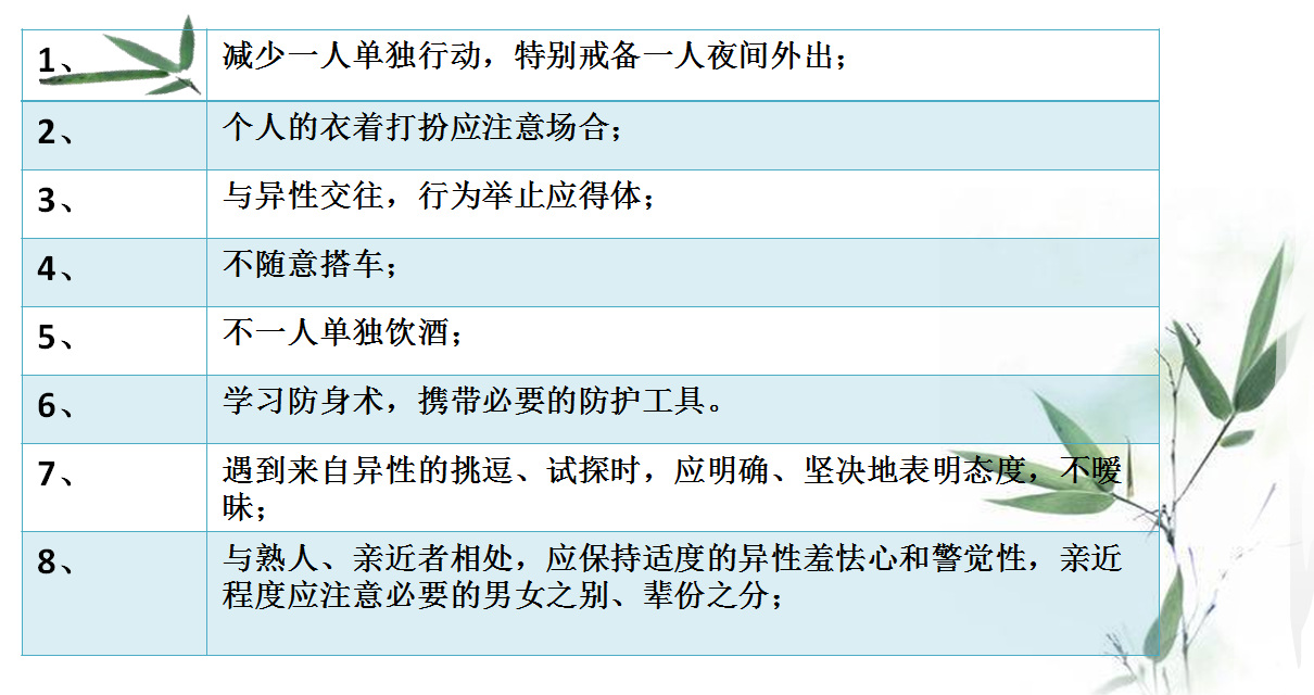 在自我防卫时,注意方式方法,尤其是处在劣势时,要冷静地处理,转移对方注意力,不激怒对方,酿成极端反应。