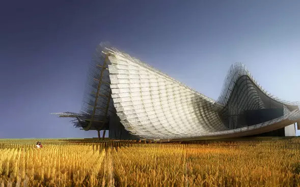 中国馆主题是“希望的田野,生命的源泉”。“希望的田野”是中国960万平方公里土地的广义“田野”,构成她的元素正是“天、地、人”