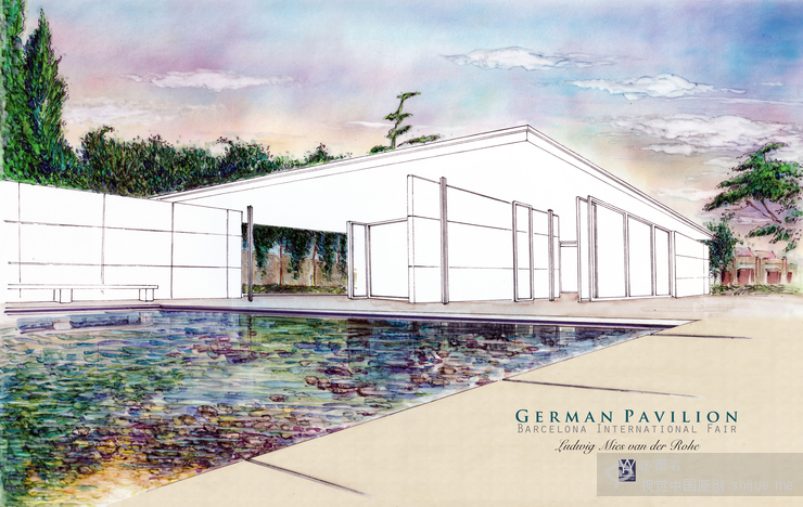 该馆由“现代主义四大师”之一的路德维希·密斯·凡·德·罗设计,博览会结束时拆除。后为纪念这一作品所开创的历史,巴塞罗那德国馆于1986年原址重建。