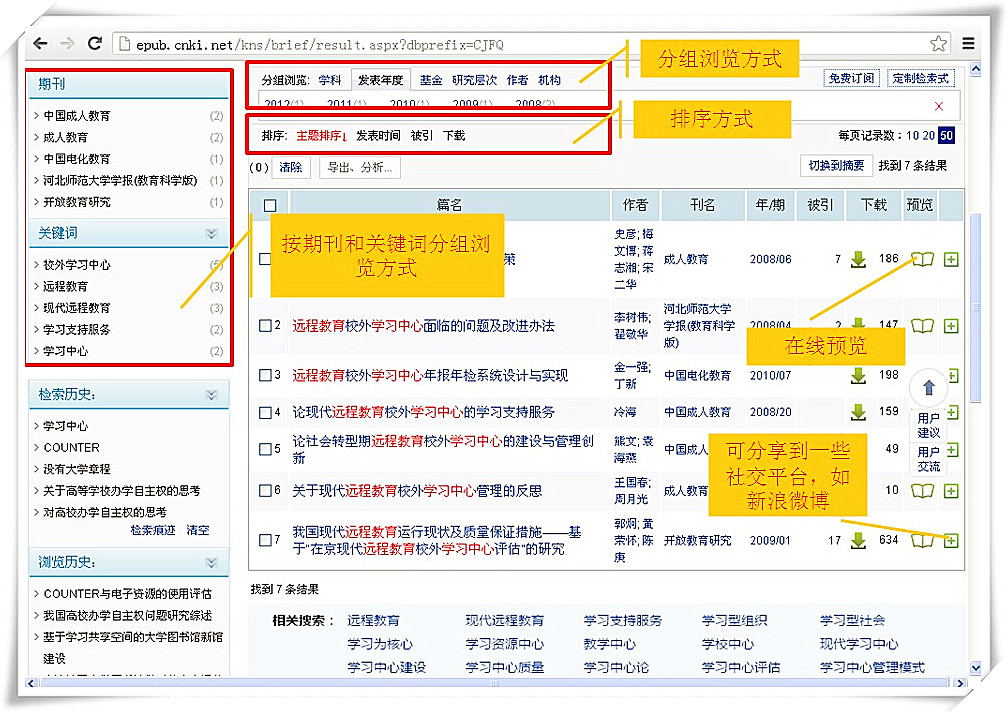 (3)检索结果:分组模式、排序方式