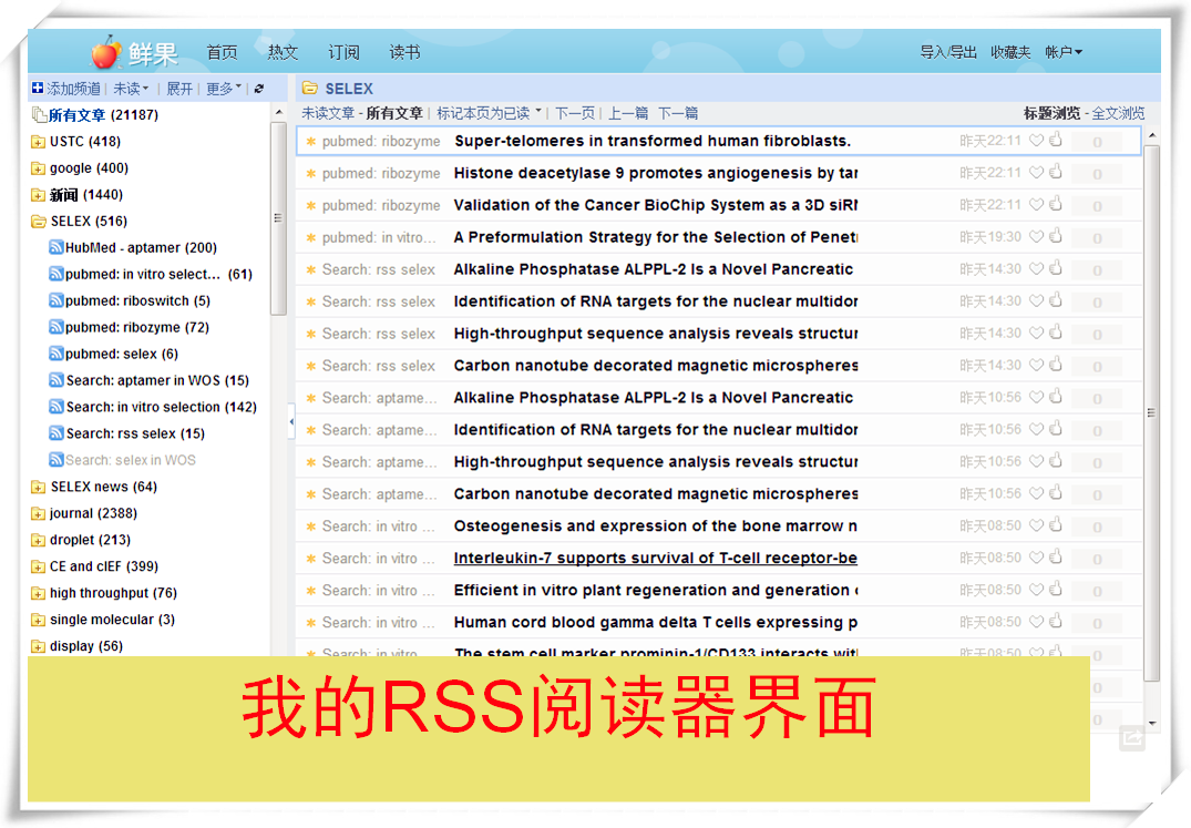 RSS阅读器是一种软件或是说一个程序,这种软件可以自由读取RSS和Atom两种规范格式的文档,且这种读取RSS和Atom文档的软件有多个版本,由不同的人或公司开发,有着不同的名字。如目前流行的有:RSSReader、Feeddemon、SharpReader等。这些软件能够实现大致相同的功能,其实质都是为了方便地读取RSS和Atom文档。Really Simple Syndication “聚合真的很简单”就是RSS的英文原意。把新闻标题、摘要(Feed)、内容按照用户的要求,“送”到用户的桌面就是RSS的目的。