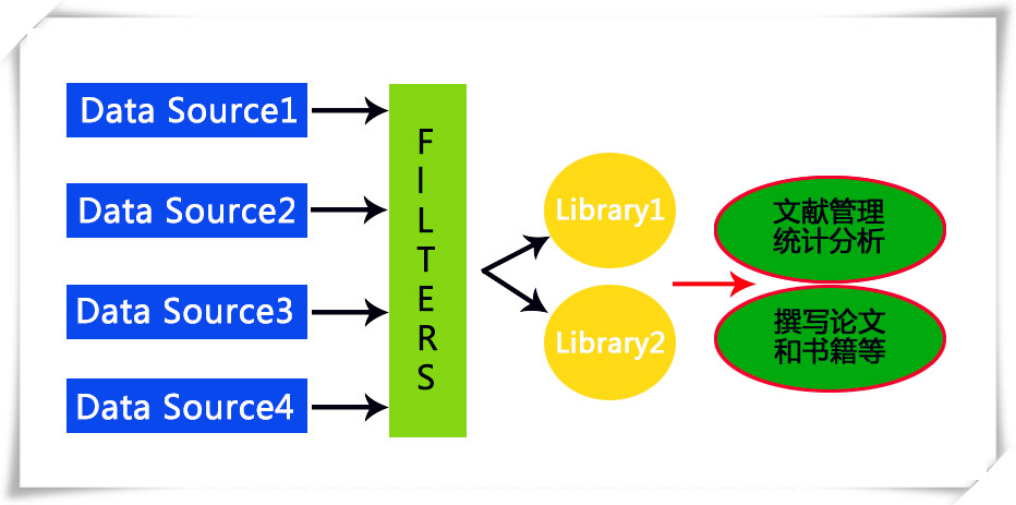 EndNote通过将不同来源的文献信息资料下载到本地,建立数据库,可以方便地实现对文献信息的管理和使用。工作原理如下图所示:
