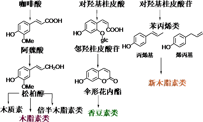 一.定义:一类含有一个或几个C6-C3单位的天然成分。主要包括: 苯丙烯、苯丙醇、苯丙酸及其缩酯、香豆素、木脂素、黄酮、木质素等。