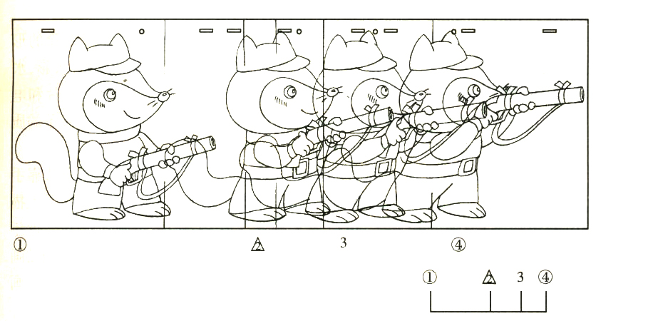 图(7)动画运动规律教材中的小狐狸举枪瞄准的动画原画,加中间画2、3两张。