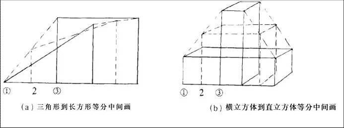下图(5)是动画运动规律教材中的三角形到长方形等分中间画,横立方体到直立方体中间画。