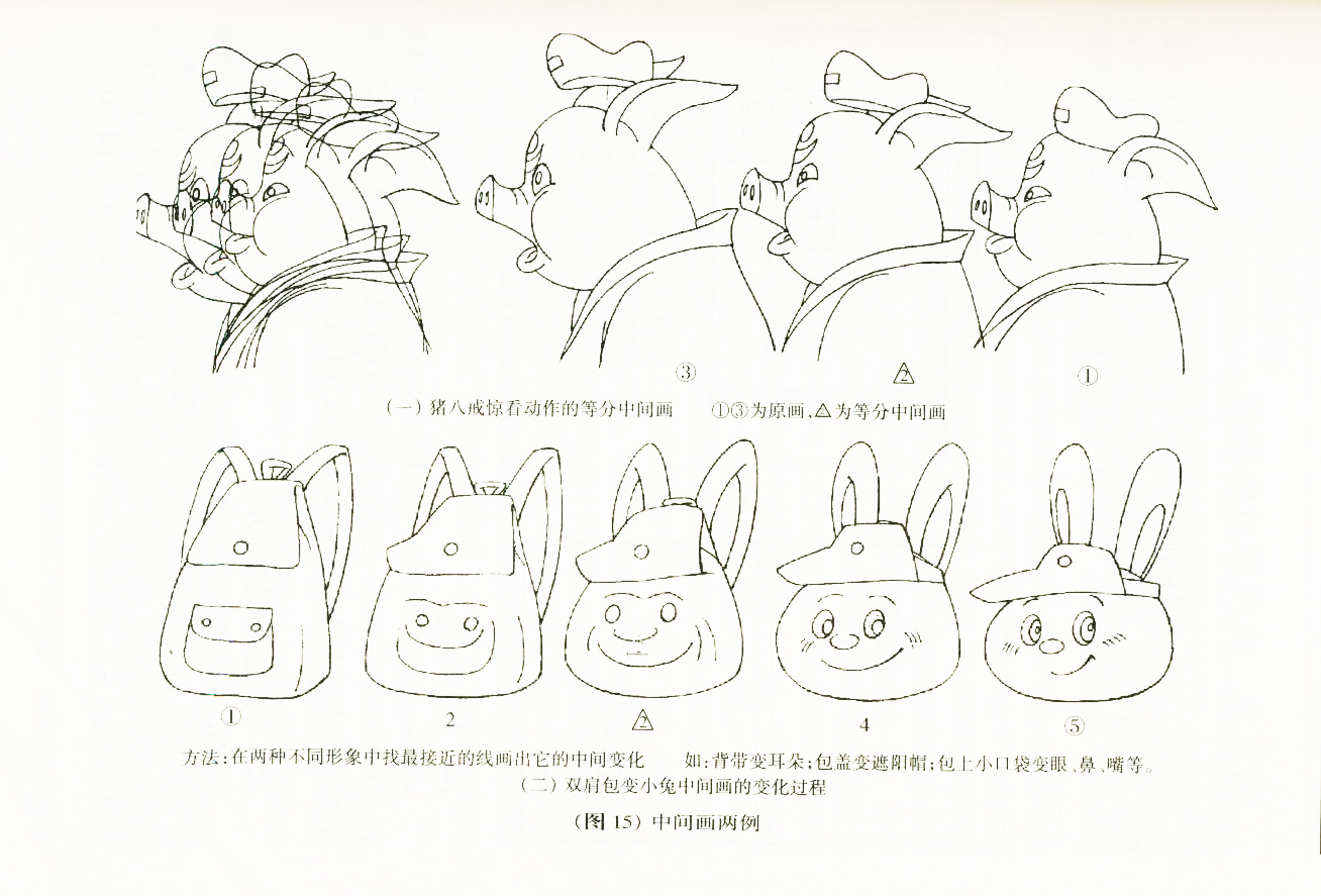 图(8)为动画运动规律教材中猪八戒惊讶的动作,书包变兔子的动画绘制练习。