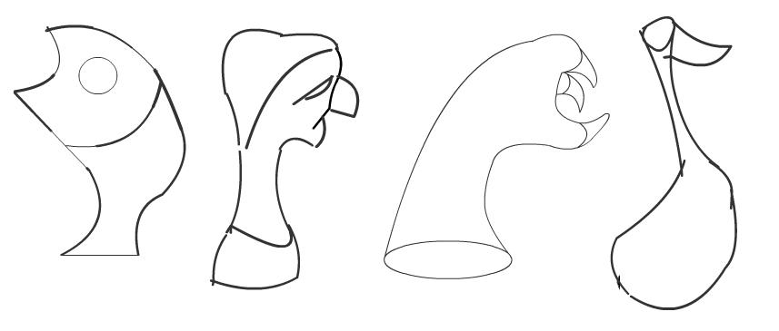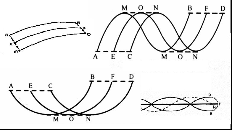 以下是动画运动规律教材中弧形的中割和波浪形的中割,用虚线连接找出中间点并画出曲线。