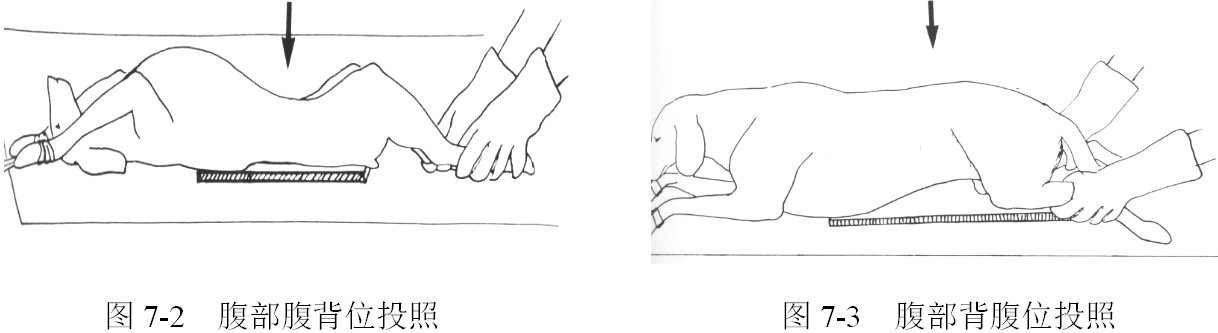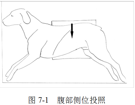 动物俯卧,前肢自然趴卧,后肢呈“蛙腿”姿势,X线束中心对准第13肋骨后缘,投照范围包括剑状软骨至耻骨的区域(见图7-3)。