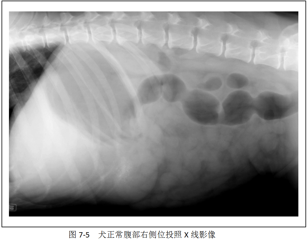 小肠包括十二指肠、空肠和回肠。小肠内通常含有一定量的气体和液体,通过气体的衬托在X线平片上可看到小肠轮廓,显示为平滑、连续、弯曲盘旋的管状阴影,均匀分布于腹腔内。一般犬的小肠直径相当于两个肋骨的宽度,猫小肠直径不超过12mm。造影剂通过小肠的时间,犬为2~3h,猫为1~2h。