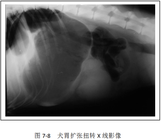 自胃底经胃体至幽门引一直线,侧位片上此直线几乎与脊柱垂直,与肋骨平行;而正位片上,此线与脊柱垂直。但在猫,正位片上该直线与脊柱平行。