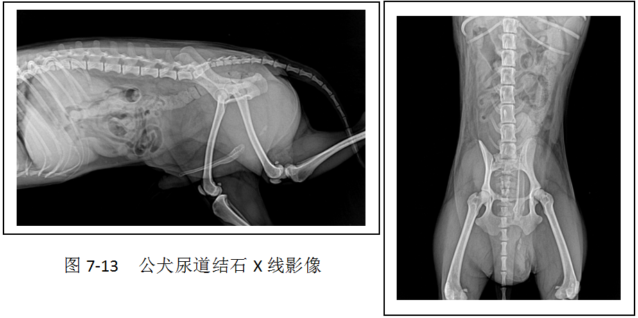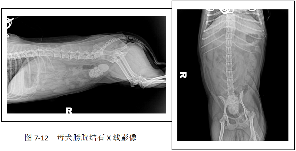 膀胱可分为膀胱顶、膀胱体和膀胱颈三部分。正常膀胱的体积、形状和位置处在不断变化之中,排尿后在X线片上不显影,充满尿液时则在耻骨前方、腹底壁上方、小肠后方、大肠下方看到卵圆形或长椭圆形(猫)均质软组织阴影。膀胱造影可以清楚地显示膀胱黏膜的形态结构。