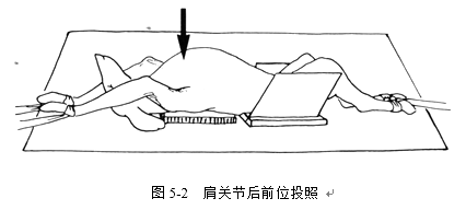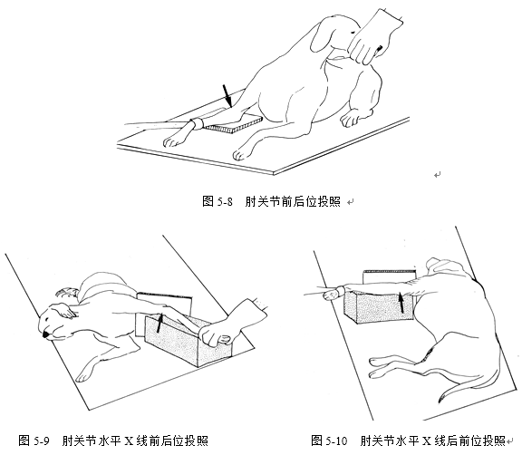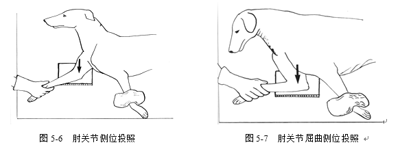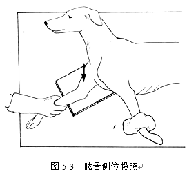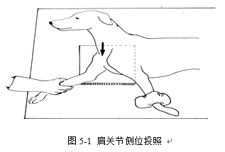 1.肩关节侧位投照 患犬侧卧,患肢在下。将患肢向下、向前拉,使肩关节在胸骨和气管的腹侧。头颈向背侧屈曲,对侧肢后拉,但不能使身体旋转。X线中心束对准肩峰(见图5-1)。