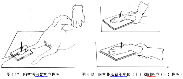 10.腕掌指部背掌位投照 患犬俯卧,患肢尽可能前推,对侧肢自然位置,头歪向健肢侧或后仰。X线中心束对准腕部(见图5-17)。有时也可用斜位投照(见图5-18)。