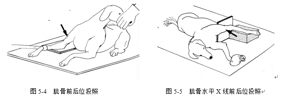 四肢骨和关节的标准摆位是前后位(背掌位、背跖位)和内外侧位。四肢的侧位投照相对容易,但四肢近端部位的前后位投照相对较难,因为很难使骨与摄影床平行。对骨和关节的合理评估至少需要两个互成直角摆位拍摄的X线片,有时可用斜位、屈曲位、负重位和应力位。投照时通常不需要麻醉或镇静,除了大型犬的肩胛骨投照,其他犬的四肢骨及关节投照不需要使用滤线器。