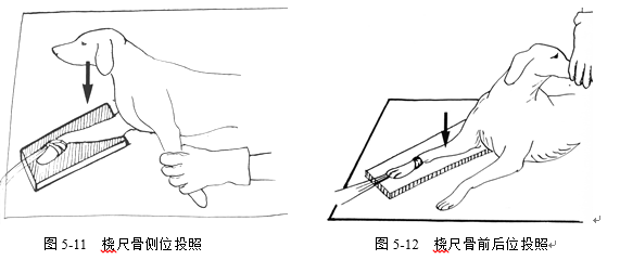 7.桡尺骨侧位投照 患犬侧卧,患肢在下,尽可能拉直。轻微屈曲腕关节,避免患肢旋后。对侧肢后拉,头颈轻微向背侧屈曲。X线中心束对准桡骨和尺骨骨体的中部(见图5-11)。