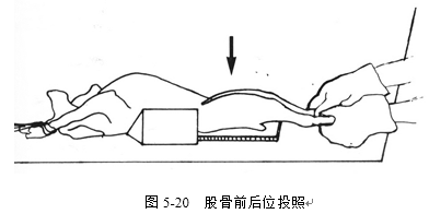 12.股骨前后位投照 患犬仰卧,适当支撑胸腹部,拉直患肢,轻微内旋,使膝盖骨正好位于滑车沟的上方。X线束中心对准股骨体中部(见图5-20)。