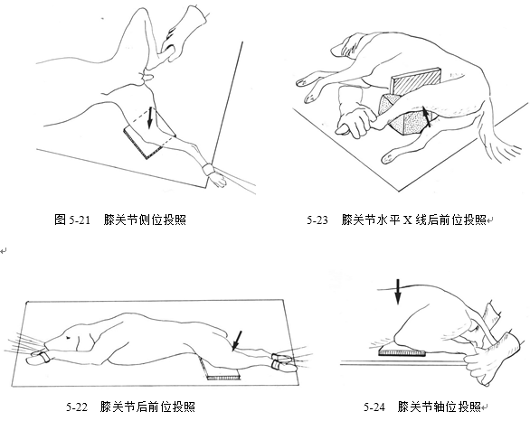 13.膝关节侧位投照 侧位投照的摆位同股骨侧位投照,只是X线中心束要对准膝关节(见图5-21)。