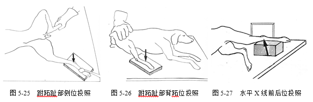 17.跗跖趾部侧位和背跖位投照 摆位同胫腓骨侧位和前后位投照,只是X线中心束要对准跗跖部(见图5-25和图5-26)。也可用水平X线的前后位投照(见图5-27)。