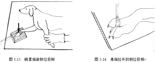 9.腕掌指部侧位投照 患犬侧卧,患肢在下,用力前推或辅助前拉,对侧肢后拉,轻微屈曲腕关节,避免患肢旋后。X线中心束对准腕部(见图5-15)。也可在腕关节过度屈曲和过度伸展下进行检查。有时为了显示患指,可将其拉开,避免重叠(见图5-16)。