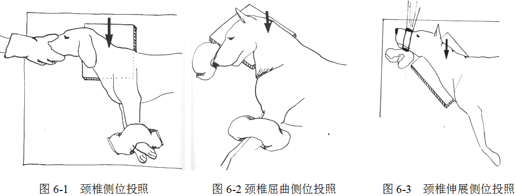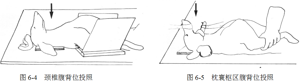 用X线可透性材料支撑脊柱,使之与摄影床平行,头部较长的犬也要支撑嘴部。前后肢和胸骨也要做适当支撑,以免脊柱扭曲。侧位投照时,患犬左、右侧位均可,但右侧位更常用。腹背位优于背腹位,但在某些损伤或疼痛的情况下也可选择背腹位。