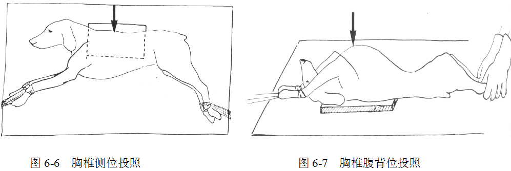 患犬侧卧,前肢前拉伸展,后肢后拉伸展,投照中心T6-7,以T9处厚度为准(见图6-6)。但是做前3节胸椎的侧位投照,则向后牵拉前肢,以免与肩胛骨重叠。