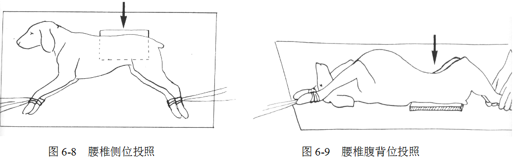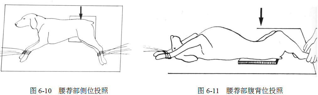 患犬侧卧,前肢轻微前拉,后肢自然或伸展,投照中心腰荐接合部(见图6-10)。