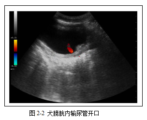 在膀胱背侧壁三角区可能见到输尿管尿液的射流。B型声像图上表现为突发的强回声斑片,彩色多普勒显示为红色脉冲流(图2-2)。输尿管射流是否明显,与膀胱内尿液与输尿管喷射的尿液比重差异有关。