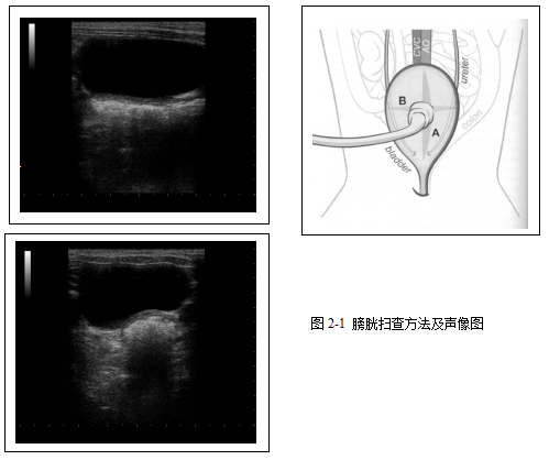 (3)选用频率为5.0-7.5MHz的凸阵或线阵探头进行扫查(图2-1)。扫查示意图显示膀胱的位置,以及膀胱背侧的结肠、主动脉、后腔静脉,以及探头纵断面和横断面扫查膀胱时的位置。纵观面观膀胱如梨形,横断面观时膀胱为圆形或椭圆形(与探头按压的用力程度有关),正常时膀胱内的尿液应为无回声。AO为主动脉,CVC为后腔静脉,ureter为输尿管,colon为结肠。