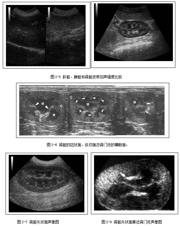 左右两侧肾脏大小相当;肾脏的包膜呈现为高回声;肾脏皮质回声强度略低于或等于肝脏回声,显著低于脾脏回声(2-5);肾脏髓质与皮质相比,髓质呈低回声结构(2-6)。猫的肾脏中由于皮质内脂肪细胞聚集,所以有时猫的肾脏皮质回声强度会高于肝脏回声。在肾脏矢状面上可显示中等回声的肾脊,其为肾髓质的延伸部分,与肾盂接触;此外肾脏矢状面上还可显示肾柱,为皮质向髓质内的延伸,将髓质分成一个个肾椎体(图2-7)。再略微靠近肾门处的肾脏矢状面,还可显示肾窦呈平行的两条高回声带状结构(图2-8)。弓形血管的管壁呈成对的、短线高回声结构,位于皮质髓质交接处。正常犬猫的肾盂偶尔可见,高分辨率的探头有助于肾盂的显影。正常犬猫的肾盂憩室和输尿管除非扩张,否则在超声上是不可见的。